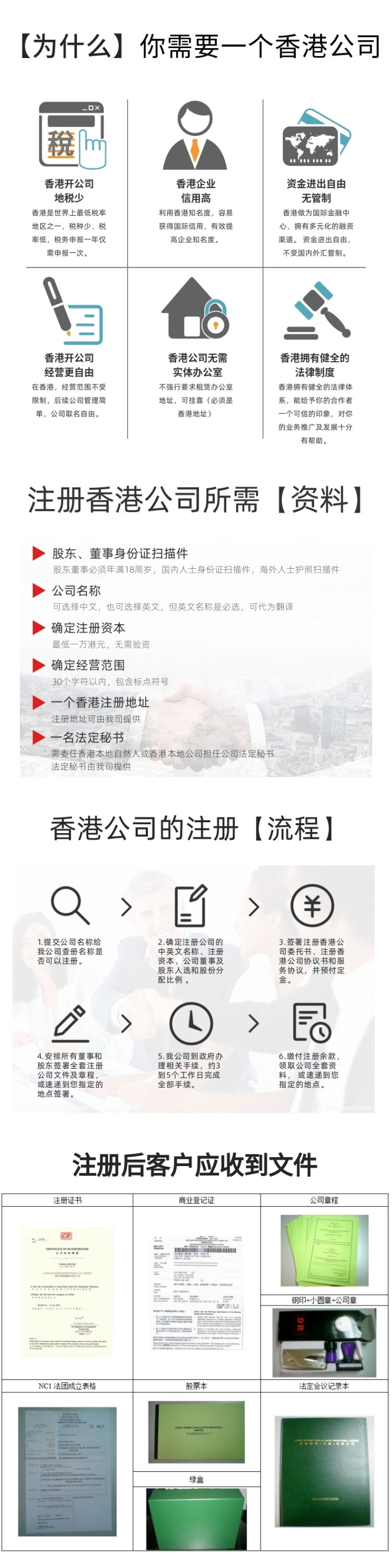 包含注冊(cè)證書、商業(yè)登記證、政府法定文件NC1文件、公司印章(小圓章簽名章、鋼?。?/span>